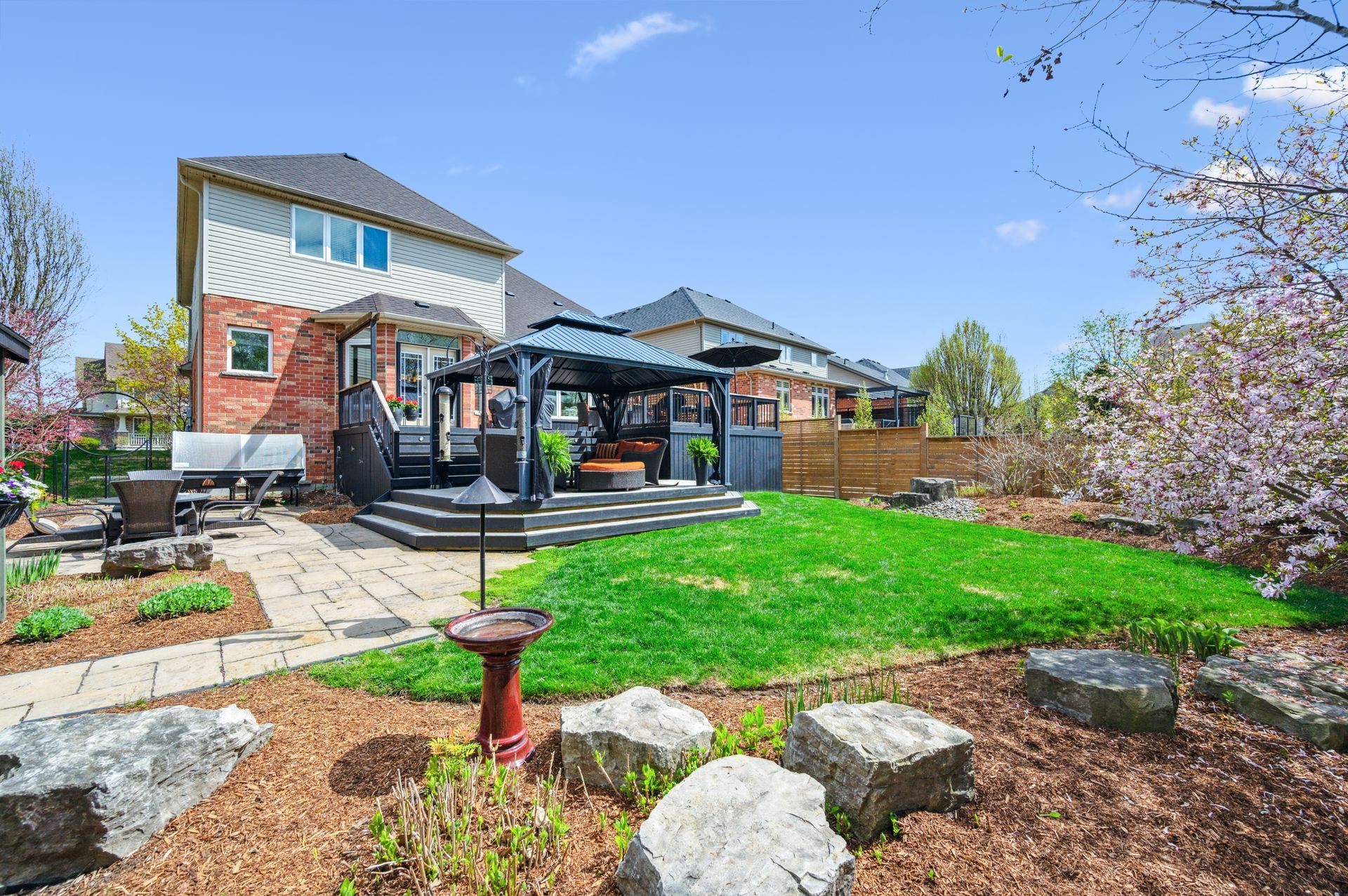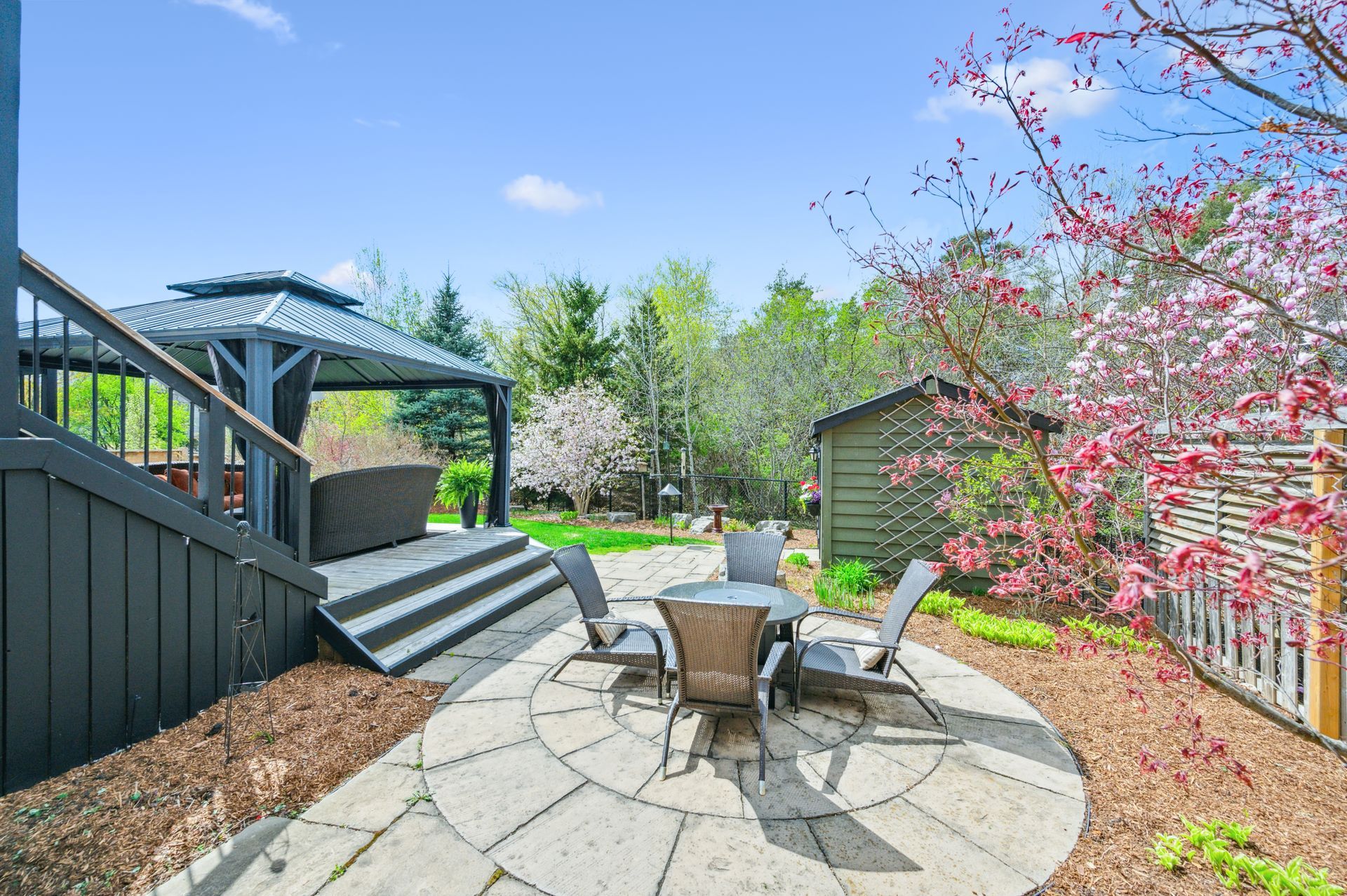 8 Ray Crescent offers a rare combination of privacy, space, and style available for the very first time. Set on a premium 50-foot lot in one of Guelphs most sought-after neighbourhoods, this 2,717 sqft. 4-bedroom home is perfectly designed for both everyday living and unforgettable entertaining. The backyard is where it truly shines surrounded by mature trees with no rear neighbours, it feels like your own private escape. Enjoy morning coffee on the oversized deck, cozy up around the fire on the lower stone patio, or host summer dinners with ease thanks to gas lines for both BBQ and fire table. A powered shed adds functional storage, and the full irrigation system keeps everything lush with little maintenance. Inside, the main floor is bright and welcoming, with a layout that flows effortlessly from room to room. The kitchen features a walk-through butlers pantry, upgraded appliances including a Wolf gas stove and plenty of cabinetry. The adjoining family room centers around a gas fireplace and large picture window with treed views. A versatile front room offers space for a formal dining area, home office, or sitting room. Upstairs, four spacious bedrooms include a calming primary suite with walk-in closet and a completely renovated ensuite boasting a glass shower, stand-alone soaker tub, and double vanity. The finished basement adds incredible flexibility with a large rec room, second gas fireplace, home bar (with fridge and dishwasher), built-in workspace for two, home gym, and a spa-like bathroom with a steam shower. A fifth room with egress window is ideal for guests, hobbies, or an additional office.With a new roof, new furnace, upgraded attic insulation, and an EV-ready garage, this home is completely move-in ready.